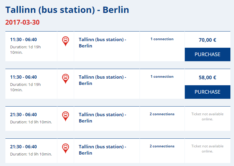 Для поездки с эстонской столицы в Берлин можно воспользоваться автобусом. Но сразу скажу, что прямого сообщения между этими городами нет. Путешествовать надо с пересадками. В таком случае продолжительность путешествия - более суток в зависимости от рейса и перевозчика.