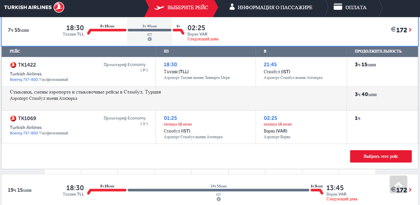 Вот пример расписания такого маршрута с сайта «Turkish Airlines».