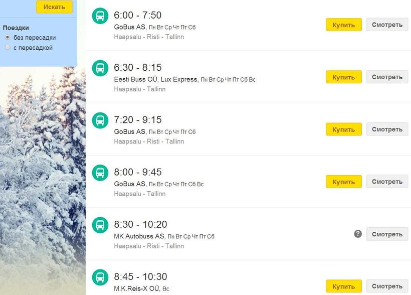 Многие перевозчики совершают прямые рейсы между этими городами. Все их можно посмотреть одновременно на сайте Tpilet или Peatus. Мне больше понравился первый вариант, там можно сразу купить билет (не на все рейсы). С шести утра и до девяти вечера есть ежедневно 20-26 автобусов, которые отправляются от автовокзала (Haapsalu, Lääne maakond).