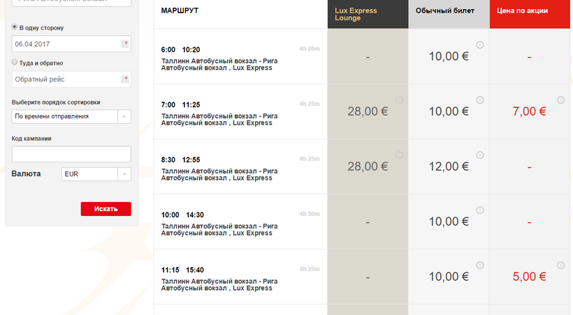 Вот так выглядит сайт «LuxExpress», в чем разница между классами билетов я так и не понял. Свой билет я приобретал по акции и спокойно пользовался всеми автобусными благами. Скорее всего разница в том, что более дорогие билеты можно в любой момент отменить или обменять на другие, а вот акционные билеты обмену не подлежат.