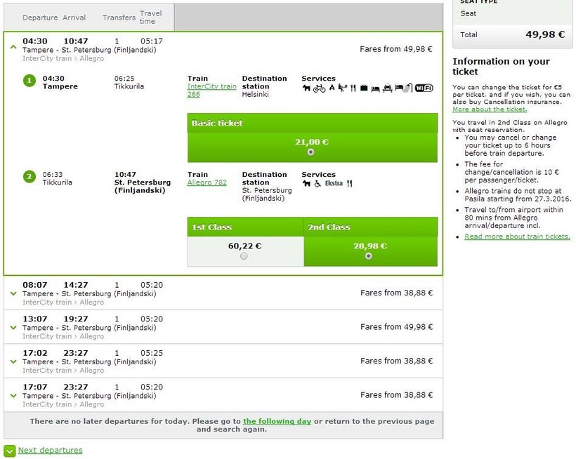 Можно приобрести общий билет Тампере-Санкт-Петербург на сайте. Или же сделать это в терминале вокзала или в кассе.