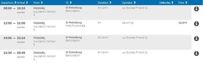 Ежедневно, кроме среды, есть такие отправления: 08:00, 12:00, 14:00, 21:30. В среду расписание такое же, но нет первого рейса. Автобусы выезжают от автовокзала Кампи в Хельсинки.