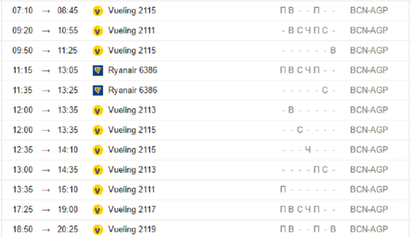 расписание которой здесь. Рейсов в Малагу достаточно, с 7 утра до 7 вечера, расписание можно почитать на онлайн табло или посмотреть на скрине ниже.