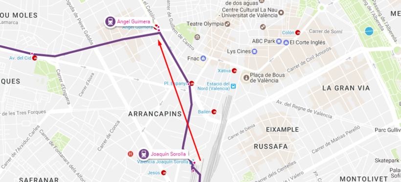 В Валенсии ещё две пересадки: одна до станции «Joaquin Sorolla» на метро, откуда пешочком бежим на вторую станцию «Angel Guimera»