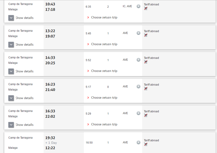 расписание смотрим на сайте. Оттуда в Малагу идут прямые поезда с 6 утра до 9 вечера. Расписание можно узнать на сайте перевозчика или же на скринах ниже.