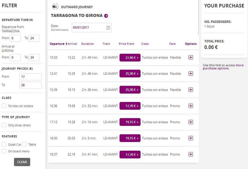 С железнодорожной станции на Passeig d'Espanya в Таррагоне каждый день отправляется 7 рейсов до вокзала в Жироне на Plaça Espanya. Правда, все они предусматривают одну пересадку. Поезда, подробнее о которых можно узнать в этой статье, начинают движение в 10:33, а заканчивают в 18:37. Даже с учетом пересадки вы потратите на дорогу от 2 ч до 3 ч 40 мин.