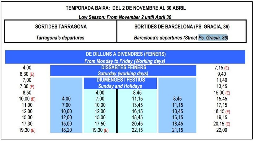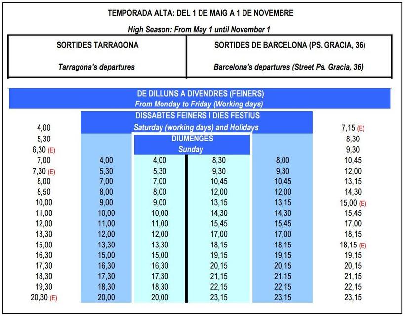 Компания Алса совершает частые перевозки в этом направлении. Независимо от дня недели, действует следующее расписание: 04:05, 06:00, 07:40, 07:55, 11:00, 16:30 и 21:10. Автобусы отправляются с остановки в Таррагоне (на CALLE PERE MARTEL), а прибывают на вокзал Barcelona Nord по адресу CALLE ALI BEI, 80. В пути вы проведете от 1 ч 10 мин до 1 ч 50 мин. Не устаю радоваться условиям в салонах Alsa: кондиционеры, туалеты, бесплатный Wi-Fi и телевизор.