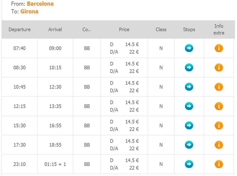 Barcelona Bus доставляет пассажиров с автовокзала Nord на автостанцию в Жироне, которая находится на площади Испании. Время в пути от 1 ч 20 мин до 2 ч 5 мин. Ежедневно есть такие отправления: в 07:40, 08:30, 10:45, 12:15, 15:30, 17:30 и 23:10.