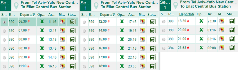 Ежедневно с автовокзала Тель-Авива, расположенного на улице Левински 108, отправляется множество автобусов компании Egged. Следуют они по маршрутам № 390, № 393 и № 394 и свой путь до Центрального автовокзала Эйлата преодолевают в среднем за 5 ч. 10 мин.