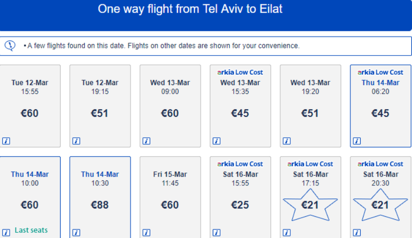Рекомендую из Тель-Авива до Эйлата покупать билеты на официальных сайтах перевозчиков Arkia Israeli Airlines и Israir, или искать дешевые билеты, например, тут.
