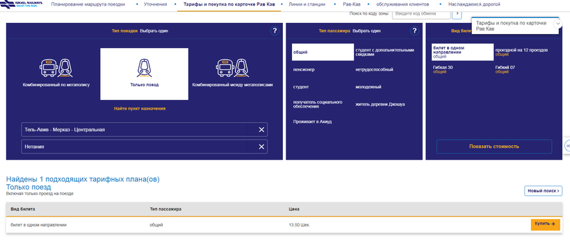Мы всегда покупали билеты в автомате на железнодорожной станции, оплачивая проезд своей банковской карточкой. Лично у меня карта ПриватБанка, у других участников поездки были карты и других банков, и ни у кого не возникло никаких сложностей при оплате. Кроме того, на станциях есть кассы, можно купить билет и там. Во всем Израиле большинство местных жителей свободно говорит и по-русски, и по-английски, поэтому языкового барьера практически не будет. Правда, возле касс часто бывают очереди, кроме того, они не всегда работают, поэтому проще купить билет все-таки через автомат. Также купить билет можно и через сайт железнодорожной компании. Для этого заходите не в раздел с расписанием поездов, а в раздел «Тарифы». Тут же можно выбрать вид билета (общий или льготный) и количество поездок. Покупка билетов онлайн доступна только для владельцев карты Рав-Кав — что-то типа нашего проездного билета, который можно пополнять на необходимые суммы.