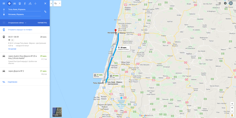 Расстояние между Тель-Авивом и Нетанией составляет всего 30 км, соответственно, на всю дорогу уйдет не более получаса.