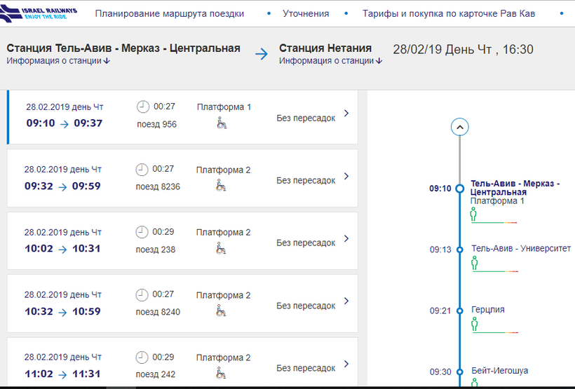 Ознакомиться с расписанием и посмотреть места расположения станций можно на официальном сайте Израильской железной дороги. Прямо при выходе из аэропорта Бен-Гурион (так называется аэропорт Тель-Авива) есть одноименная железнодорожная станция, поэтому уехать в Нетанию можно прямо оттуда, не заезжая в город.