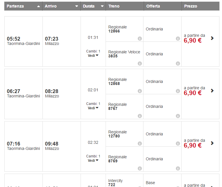 Ниже приведена информация о том, сколько часов вам потребуется, чтобы добраться от Таормины до Милаццо, а также приведена примерная стоимость проезда (средняя цена билета) на том или ином виде транспорта.