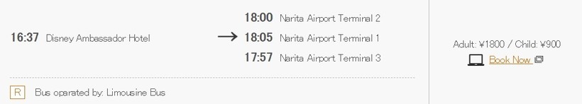 До аэропорта курсируют автобусы известной в Токио компании Limousine Bus, конечная у них в самом аэропорту «Нарита». У них много точек посадки в Токио (смотрите скриншот). Ходят автобусы с утра и до позднего вечера через каждые тридцать минут. Если сядете на автобус, например, на Disney Ambassador Hotel, то дорога до первого терминала аэровокзала займет немногим больше 20 минут.