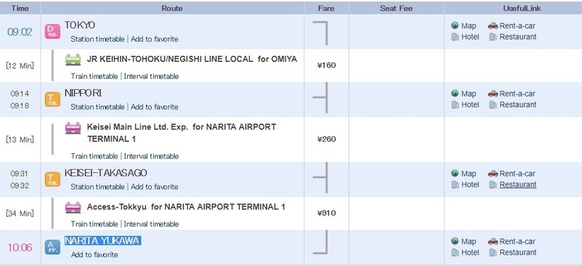 Ниже приведена информация о том, сколько часов вам потребуется, чтобы добраться от Токио до Нариты, а также приведена примерная стоимость проезда (средняя цена билета) на том или ином виде транспорта.