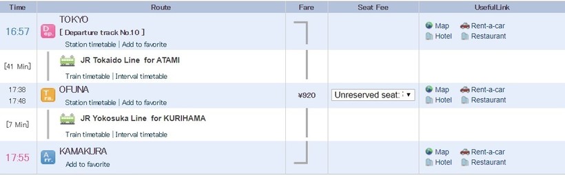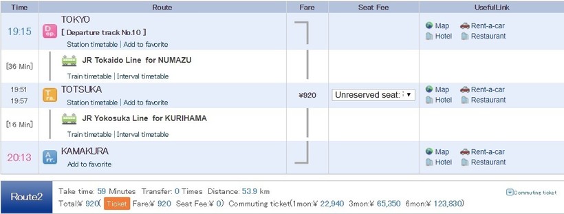 Ниже приведена информация о том, сколько часов вам потребуется, чтобы добраться от Токио до Камакуры, а также приведена примерная стоимость проезда (средняя цена билета) на том или ином виде транспорта.