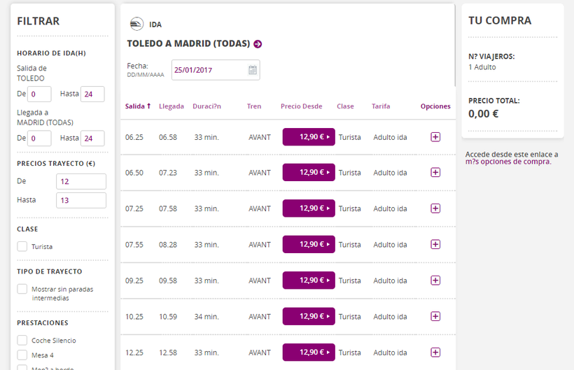 - Из Толедо в Мадрид за полчаса можно добраться на поездах категории AVANT. Поездов в течение дня курсирует около двух десятков, первый доступный в 06.25, а последний - в 21.30. Интервал между отправками этого транспорта - от одного часа и до двух. Транспорт начинает движение с железнодорожного вокзала Толедо, находящегося по адресу Paseo de La Rosa, s/n.