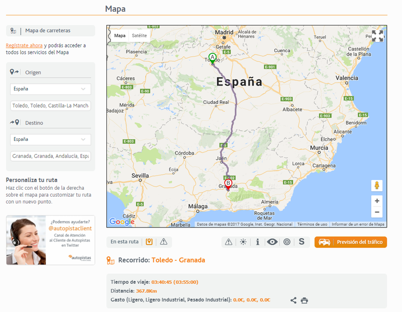 Отправление автобуса проходит с автобусной станции Толедо (Avenida Castilla La Mancha s/n) в 12.00, а прибытие в Гранаду на Av. de Juan Pablo II, s/n в 17.30.