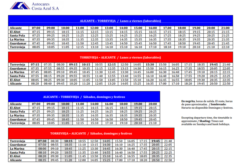 Так, из Торревьехи в Аликанте можно добраться на автобусе от Costa Azul. Автобусов в течение дня курсирует около десятка, первый выезжает на посадку уже в семь утра. Подробно посмотреть расписание можно на портале перевозчика.