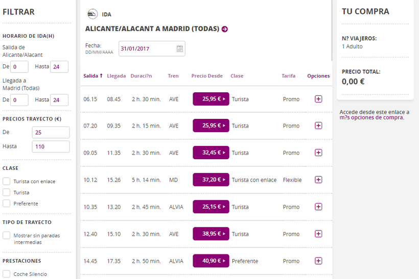 Из Аликанте в Мадрид можно добраться уже на железнодорожном транспорте. С железнодорожного вокзала Аликанте (Av. Salamanca, 1) в Мадрид в течение дня курсирует более десятка поездов в основном категорий AVE, о которых можно более подробно прочитать здесь. Так же первый поезд отправляется с самого утра в 06.15, последний - в 20.10. Расписание, если надумаете использовать такой способом, лучше смотрите на сайте перевозчика.