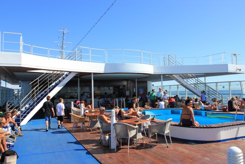 Паром представляет из себя огромное судно, чем-то даже напоминающее лайнер, а такие как я, живущие в тысяче километров от моря и вовсе от лайнера не отличат) Поездка занимает 8-10 часов, поэтому на судне есть каюты. Самые дешевые билеты продаются без мест, но днем время можно скоротать в баре или возле бассейна. Немного дороже стоят билеты в общем зале, где находятся кресла, как в зале ожидания на вокзалах. Этот вариант также больше подходит для дневной поездки. Днем таких вольно шатающихся без мест достаточно, а вот на ночные рейсы большинство пассажиров стараются купить билет в каюту, хотя цены очень кусаются. От сюда и возникает дилемма: потратить день на поездку, но доехать дешевле или раскошелится на ночной переезд.