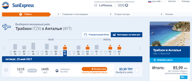 Для начала лучше посмотреть билеты через сервисы на подобии вот такого. В том году цены были одни, в следующем они могут быть другими – лучше сравнить конкурентов. Также вы можете самостоятельно посмотреть билеты через сайты авиаперевозчиков, о которых я писал выше. Вот ссылки: SunExpress, Pegasus Airlines и Atlasglobal.
