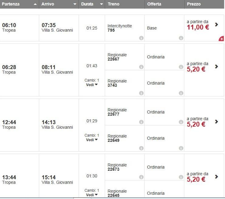 Итальянская железная дорога охватывает практически все города и даже многие мелкие деревушки, поэтому я считаю, что поезд - самый удобный транспорт между городами Италии. От вокзала по адресу 89861 Тропеа, Вибо Валентия отходят поезда по направлению Мессины, начиная с 06:10 и заканчивая 19:44. Самый первый рейс - единственный прямой, его обслуживает скоростной поезд Intercitynotte. Остальные варианты включают пересадку в Rosarno и обслуживаются составами Regionale. Интервал между отправлениями поездов - от 20 мин до 6 ч 16 мин, а в среднем - 1 час. До вокзала в Мессине на Piazza della Repubblica ехать 1:25-1:49, смотря какой рейс. Я всегда удивлялась, как может поезд переправиться через водное пространство. Как оказалось, они специально оборудованы особыми платформами для погрузки на паром, пассажирам выходить из вагонов не нужно. После переправы поезда опять становятся на рельсы.