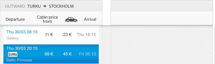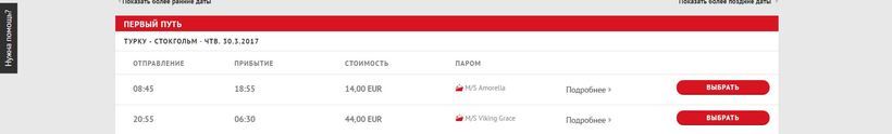 Как видно, кораблей также два, они носят названия Amorella и Viking Grace. Корабли достаточно сильно отличаются друг от друга, Amorella это старый паром 1988 года постройки, а Viking Grace спущен на воду в 2013, потому и билеты на него дороже.