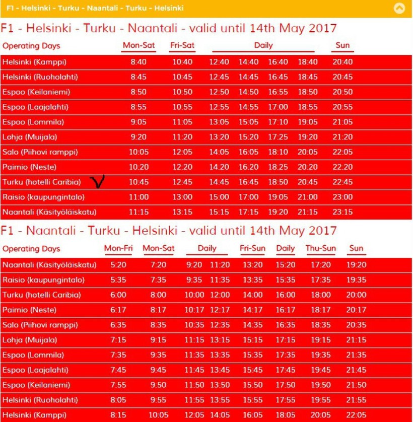 Из Турку в Наантали можно добраться автобусом компании Onni Bus. Этот маршрут обслуживают рейсы лини F1. Вот расписание.