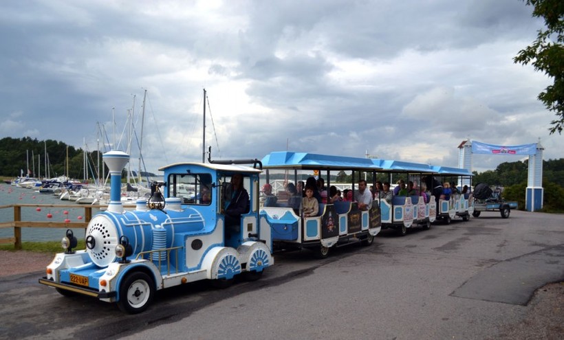 От пристани к входу на сказочный остров можно добраться пешком. Я с мужем проехалась на таком поезде.