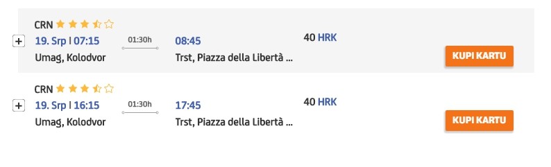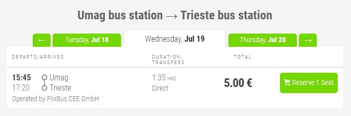 Для путешествия по такому маршруту можно воспользоваться автобусами. Это, кстати, единственный общественный транспорт, что курсирует из Умага в Триест, ведь в данном хорватском городке нет железнодорожного вокзала, поэтому таким транспортом воспользоваться нельзя.