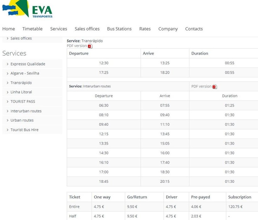 Расписание я нашла на сайте региона Алгарве. Государственные автобусы довезут вас от ЖД станции до автовокзала города за 8 минут. Ездят они довольно часто, с семи утра до семи вечера, ждать долго не придется. Билеты покупать нужно у водителя, но вот сколько они стоят, я не могу сказать точно. Предположительно, в районе двух евро.
