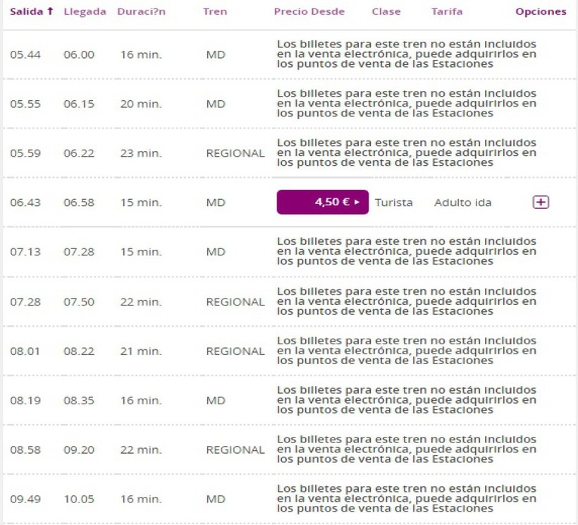 Через Интернет приобрести билеты получиться только на некоторые поезда категории MD. В расписании на сайте Renfe напротив таких рейсов указана цена. На остальные рейсы MD и все поезда REGIONAL в направлении Флассы можно приобрести только в кассах вокзала. В кассе нам дали картонные билетики небольшого размера. При входе на платформу его необходимо засунуть в специальный автомат, который его закомпостирует.