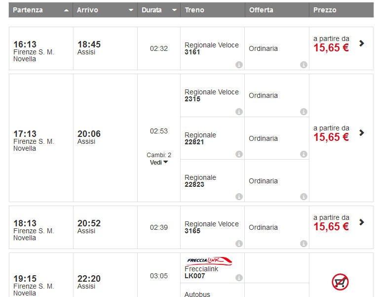 Поездов, следующих из Флоренции в Ассизи, не очень много, они курсируют примерно каждый час-полтора. Есть один ночной рейс, но в дороге нужно будет провести в три раза дольше, чем обычно, поэтому такой вариант я не рассматривала. Итак, первый рейс выезжает с вокзала Firenze S. M. Novella в 05.50, последний – в 21.42.