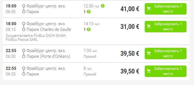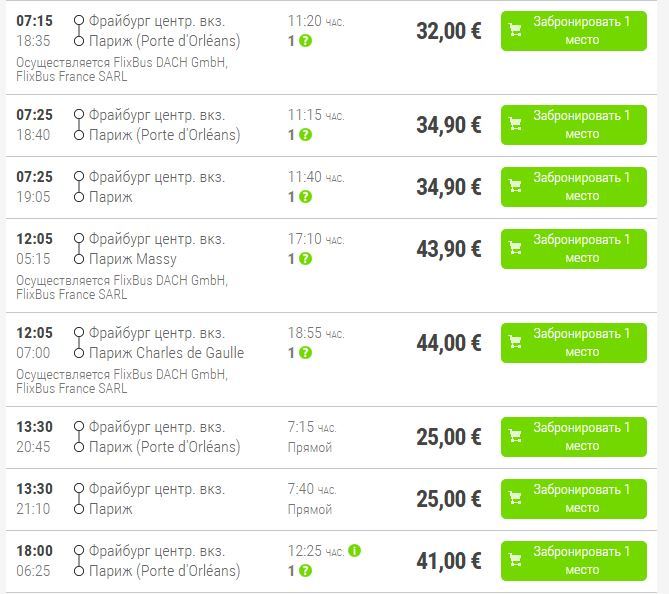 Ниже приведена информация о том, сколько часов вам потребуется, чтобы добраться от Фрайбурга до Париса, а также приведена примерная стоимость проезда (средняя цена билета) на том или ином виде транспорта.