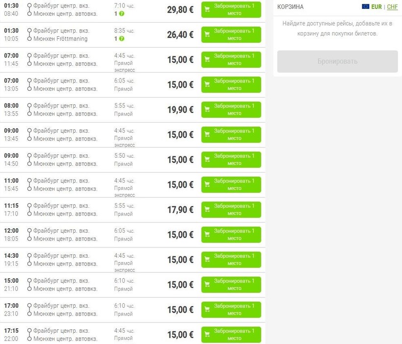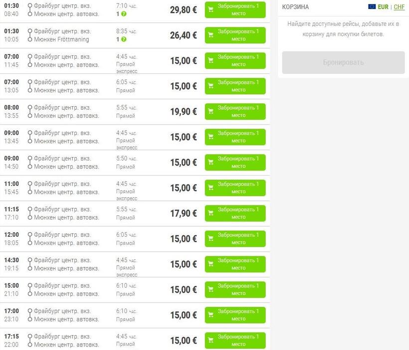 С утра до вечера ездят прямые автобусы Flixbus до Мюнхена. В день есть от 6 до 12 прямых рейсов, вполне можно подобрать себе удобный по времени. Они доезжают до Мюнхена за 4:45-6:10, зависит от маршрута. Отправляются автобусы от остановки на Bismarckallee 3, прямо рядышком возле Главного ЖД вокзала Фрайбурга. А в Мюнхене автобус останавливается на Центральном автовокзале на Arnulfstraße 21 (от ЖД – 800 м). Люблю пользоваться услугами этого перевозчика, мне нравятся у них адекватная цена проезда, современные салоны и сервис.
