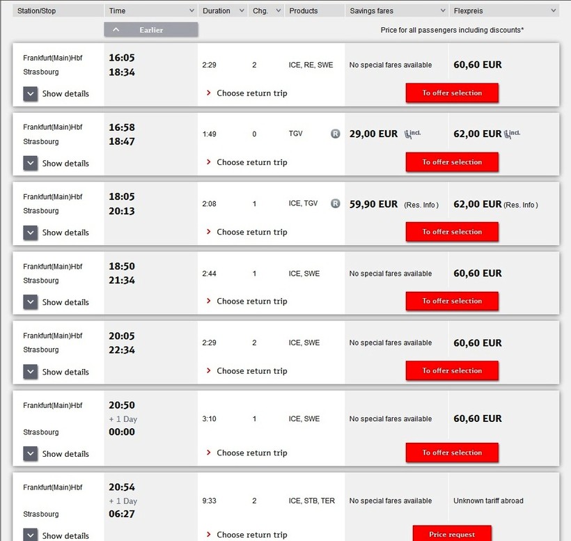 Из Франкфурта в Страсбург можно уехать начиная с 4 утра. Последний рейс в данном направлении отправляется примерно в 10 вечера. Беспересадочных рейсов в течение дня несколько. Первый в 6:58 курсирует ежедневно за исключением субботы. Рейсы в 13:58 и 16:58 отправляются ежедневно. Остальные рейсы предполагают 1-2 пересадки, например, в городах Оффенбург и Карлсруэ.