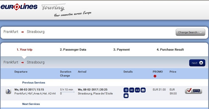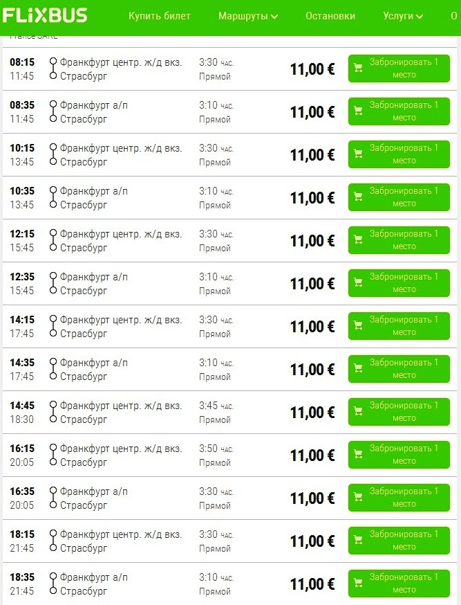 Рейсы из Франкфурта в Страсбург у этой компании есть в расписании ежедневно. Первый прямой рейс отправляется в 8 утра, последний в 18:35. Автобусы покидают Страсбург с промежутком между рейсами примерно в два часа. Время в пути составляет 3-4 часа. В среднем же около 3,5 часов. Станция отправления может отличаться. Вы можете сесть на автобус либо у железнодорожного вокзала, либо в аэропорту. Все зависит лишь от того, что вам удобнее.