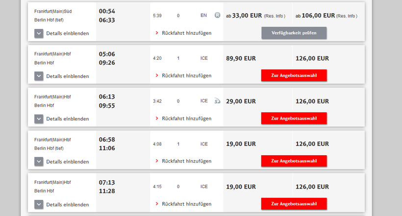 Первый состав отправляется с главного вокзала Франкфурта в 00:54, потом будет довольно большой интервал до 05:06. Далее составы выезжают в Берлин едва ли не каждые полчаса. Некоторые маршруты предусматривают пересадку в Касселе, поэтому будьте внимательны при покупке билета.