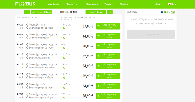 Я замечала, что в Европе очень часто путешествие на автобусе выходит более дешевым чем поездка на поезде. Между Франкфуртом и Берлином курсирует масса автобусов транспортных компаний FlixBus.