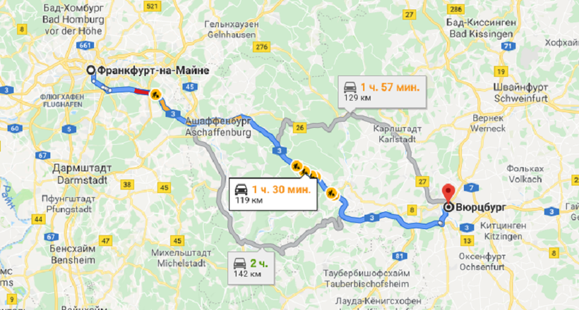 Франкфурт — Вюрцбург — маршрут на карте