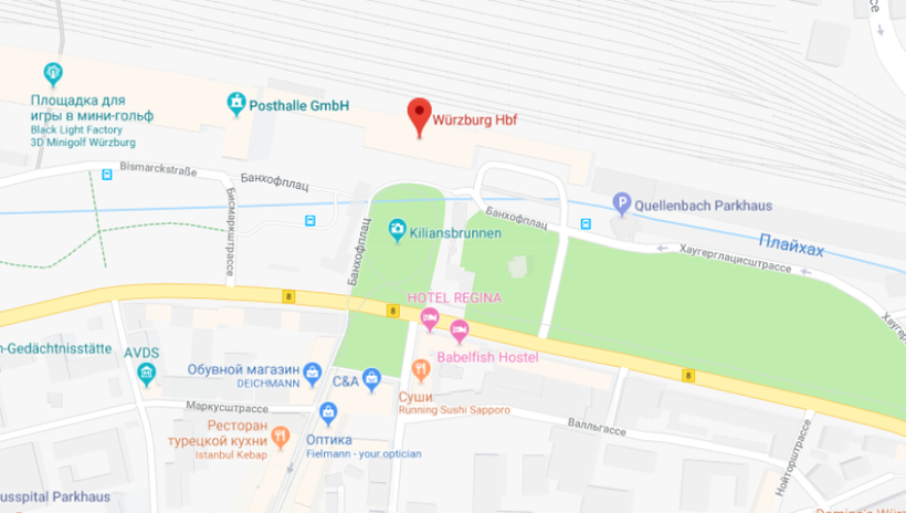 В Вюрцбурге поезда прибывают на ж/д вокзал на Bahnhofplatz 4.