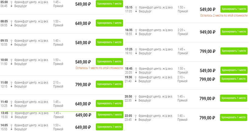 Билет из Франкфурта-на-Майне в Вюрцбург на поезд Intercity-Express и Inter City стоит от 20 евро (1460 рублей), а на поезд Regional-Express (как ни странно) — от 30 евро (2200 рублей).