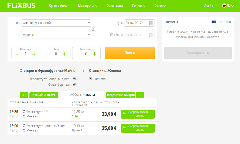 Я прошерстил сайты всех компаний которые предлагают доставить человека из Франкфурта в Женеву. Подумал, подумал.... И в результате оказался на франкфуртском ЖД вокзале. Но сел я не на поезд, а на автобус компании «Flixbus». Каждый день в 8 утра в Женеву уходит по одному автобусу этой компании, на конечную станцию – международный автовокзал Женевы, автобус приезжает примерно в 6 вечера. Это переезд не из самых приятных, но в салоне был туалет и wi-fi, а сиденья в автобусе достаточно мягкие и, по крайней мере, первые 6 часов ехать вполне комфортно. Жалко, что не было ночного рейса, но что поделать, главное достоинство поездки на автобусе – стоимость проезда, о ней немного ниже.