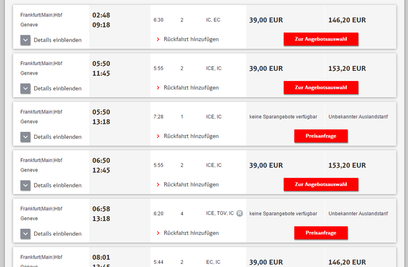 Можно было добраться в Женеву и на поезде, это быстрее, но немного дороже. Поезда отправляются из Центрального ЖД вокзала Франкфурта и приезжают на женевский вокзал Корнавен, он находится в самом центре города. Но есть нюанс – прямых поездов нет, придётся ехать как минимум с одной пересадкой. Чтобы подобрать себе маршрут проще всего пользоваться сайтом «Deutsche Bahn». Там можно посмотреть все варианты, со всеми пересадками и выбрать самый оптимальный – наиболее дешёвый или быстрый. В среднем, дорога на поезде занимает от 6 до 7 часов, считая время на пересадку. В Женеву ходят скоростные поезда ICE (InterCityExpress) и IC (InterCity), на весь маршрут можно купить один единый билет. Больше информации о железных дорогах Германии можно найти вот здесь.
