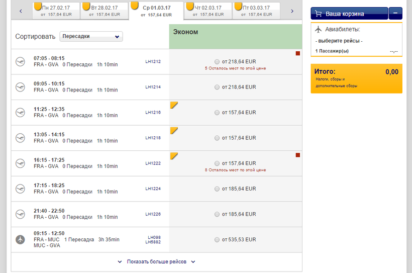 Вот пример расписания, которое можно увидеть на сайте «Lufthansa».