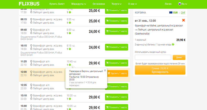 Изучая способы добраться в Лейпциг, я также зашла на сайт FlixBus. Как выяснилось, в случае маршрута Франкфурт-Лейпциг прямой маршрут только один. Автобус отправляется с аэропорта в 23:25 (к железнодорожному вокзалу он подъезжает к 23:55), прибывая к центральному вокзалу Лейпцига в 04:40. Все остальные рейсы предусматривают пересадку в Берлине, Ганновере, Нюрнберге или другом городе, из-за чего дорога занимает слишком много времени.