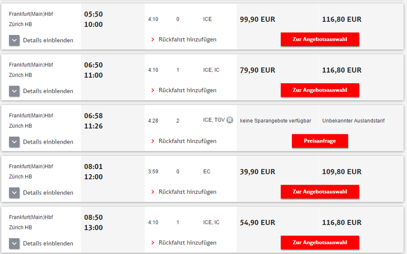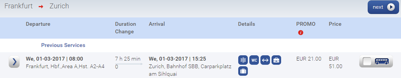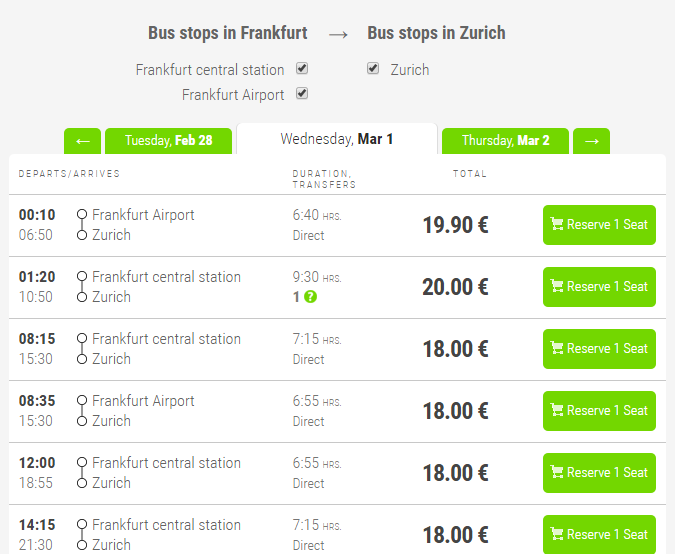 Ниже приведена информация о том, сколько часов вам потребуется, чтобы добраться от Франкфурта-на-Майне до Цюриха, а также приведена примерная стоимость проезда (средняя цена билета) на том или ином виде транспорта.