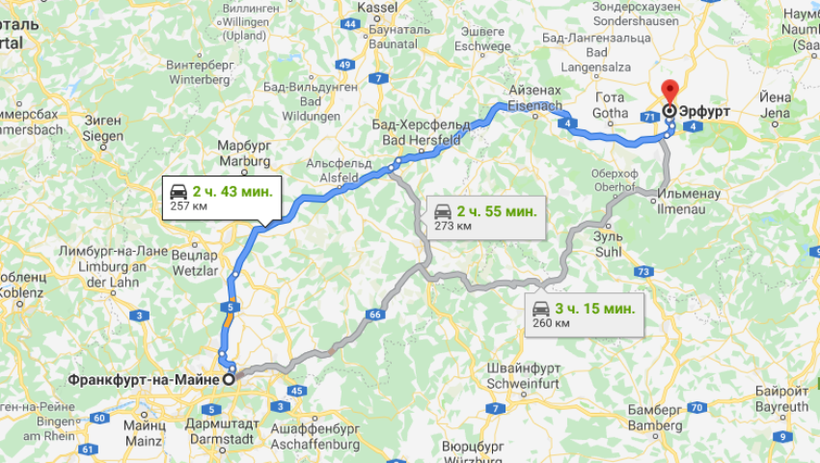Франкфурт-на-Майне и Эрфурт разделяют почти 260 км, и проехать такое расстояние за рулем автомобиля можно примерно за 3 часа.
